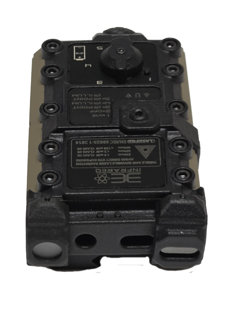 Co-Witnessed – Visible Green laser, Infrared laser, VCSEL Illuminator, Black 6061 Aluminum Housing, CRANE/Switch port (Override Green ONLY), Primary fire button (5-position selector switch). Laser ships with free Unity Tactical Modbutton Lite switch.